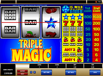 Игровой слот Triple Magic содержит такие символы: вишни, бары трех видов, три семерки, звезды. Отличительной особенностью слот-машины является наличие двух видов монет, номинал которых составляет от 0,25 до 10 кредитов. Минимальную прибыль принесет комбинация из вишен, которая оплачивается с коэффициентом х2 при выпадении одного символа, х5 – при выпадении двух символов и х20 принесут три рядом стоящих изображения. Три одинарных бара оплачиваются с коэффициентом х10, три двойных с х25, три тройных с х50. За комбинацию символов 777 в зависимости от суммы ставки можно получить от 100 до 200 кредитов, Наибольшую прибыль принесет символ три звезды в размере от 800 до 1 600 кредитов! Удачи в игре!